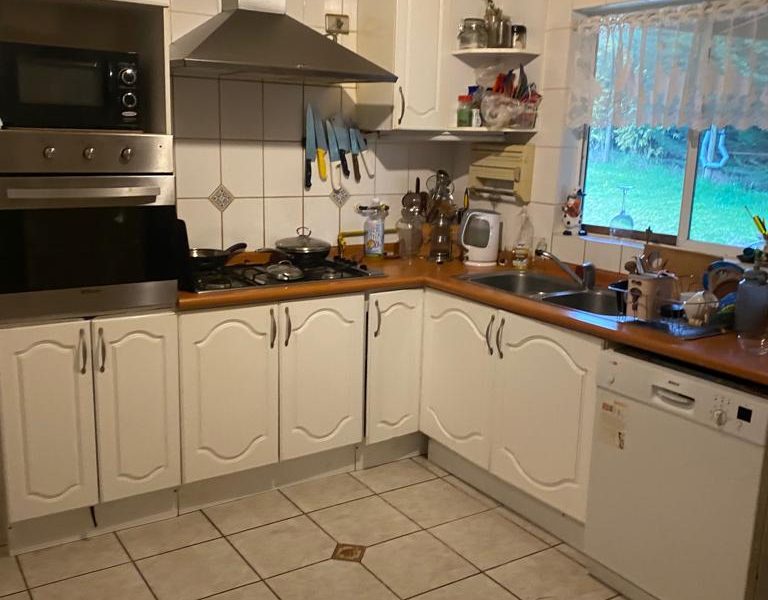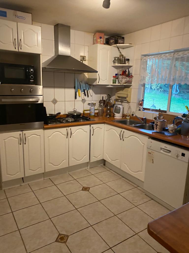 Amplia cocina con muebles, horno empotrado, campana y cocina encimera de 6 platos.